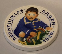 1910 Børnehjælpsdags plakette Dreng med krans og buket 1910 af Rasmus Harboe 753-659 8,7 cm Royal Copenhagen Aluminia fajance Børnehjælpsplatte