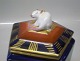 Description: Bing and Grondahl Lidded pentagon vase with figural Dahl Jensen ? mouse on top Royal Bley and gold 14 cm Marked with the three Royal Towers of Copenhagen. Bing & Groendahl In mint and nice condition