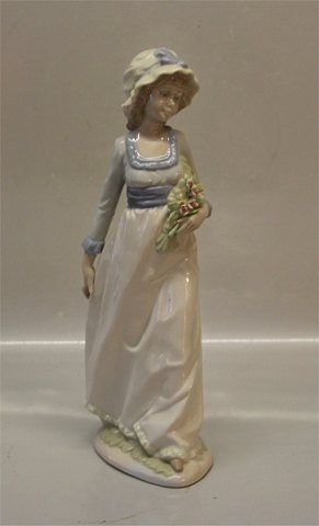 Beskrivelse: Stor Spansk figur Nadal: Pige med kyse og blomster 34 cm I stil med Lladro, Dao, Nao fra Spanien Mærket Nadal Handcrafted Spanish Porcelain