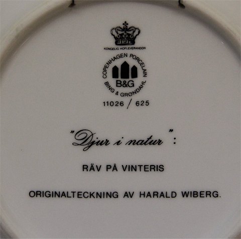 Description: B&G 11026-625 "Djur i natur" Anmals in the nature FOX on the ice. Orininal drawing by Harald Wiberg 2 cm Bing & grondahl plate