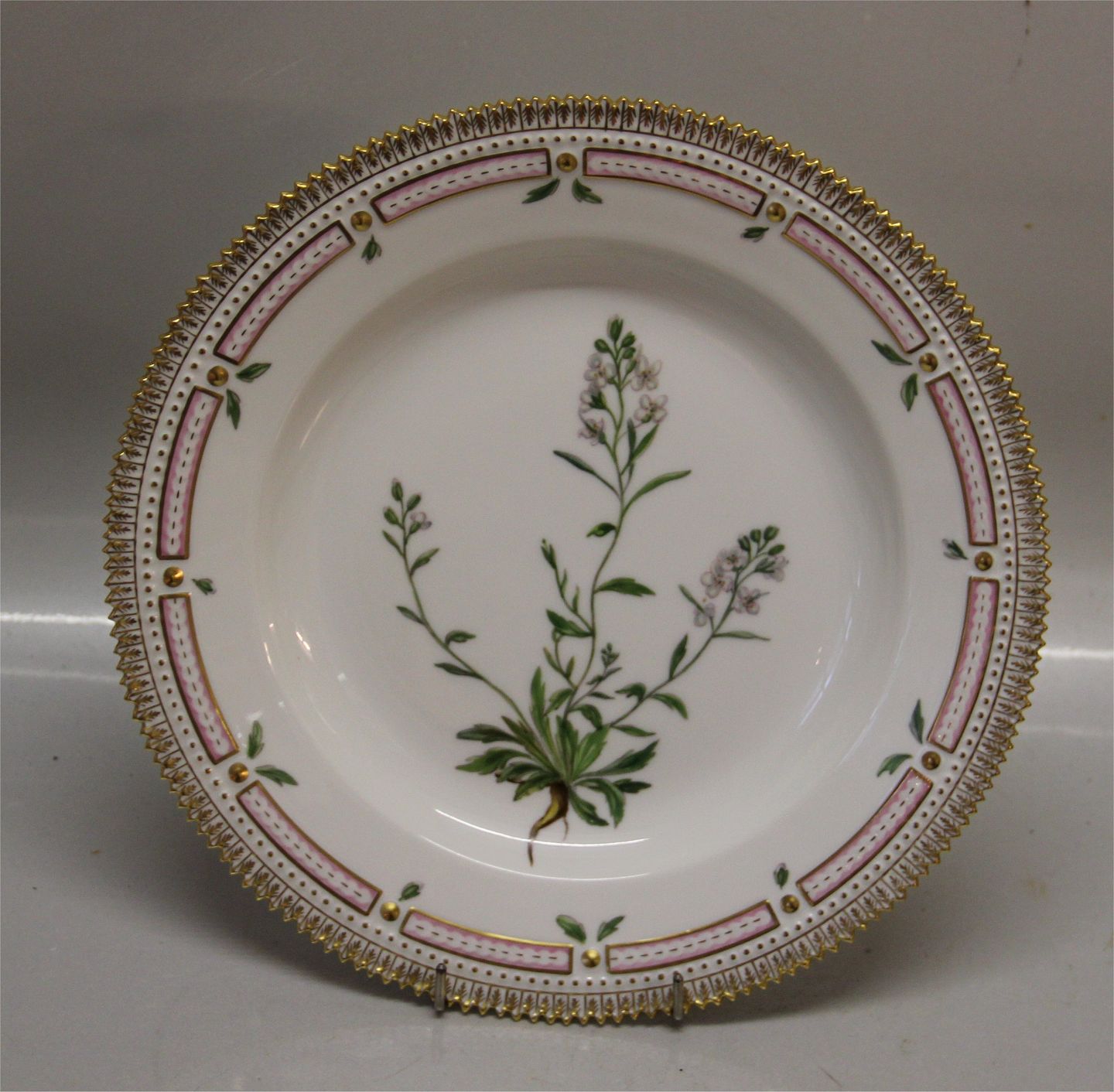 Description: Royal Copenhagen Flora Danica 20-3549 Traditional Dinner Plate: Gardamina petraea L . New # 624 10" (From the year 1959). Floral decoration on pearl pattern with gold rim. Factory first and in nice and mint condition