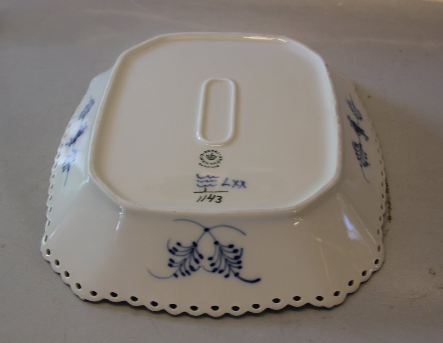 Beskrivelse: Kongelig Dansk Porcelæn Musselmalet Helblonde 1143-1 Brødbakke, firkantet 23 x 31 cm (420) 2. I fin og hel stand