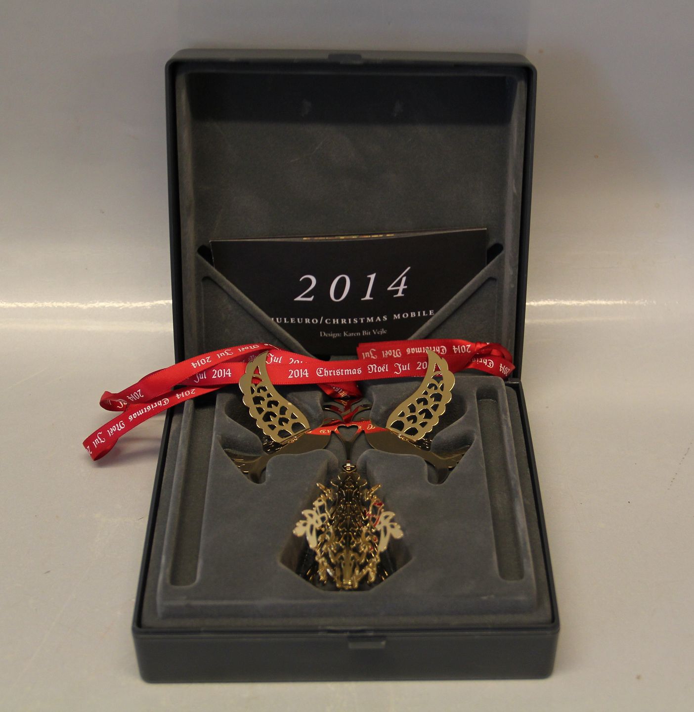 Description: 2014 Christmas tree and doves Design Karen Bit Vejle Georg Jensen Christmas Mobile crafted in brass, plated with 24 carat gold. Pigeon and fir tree
