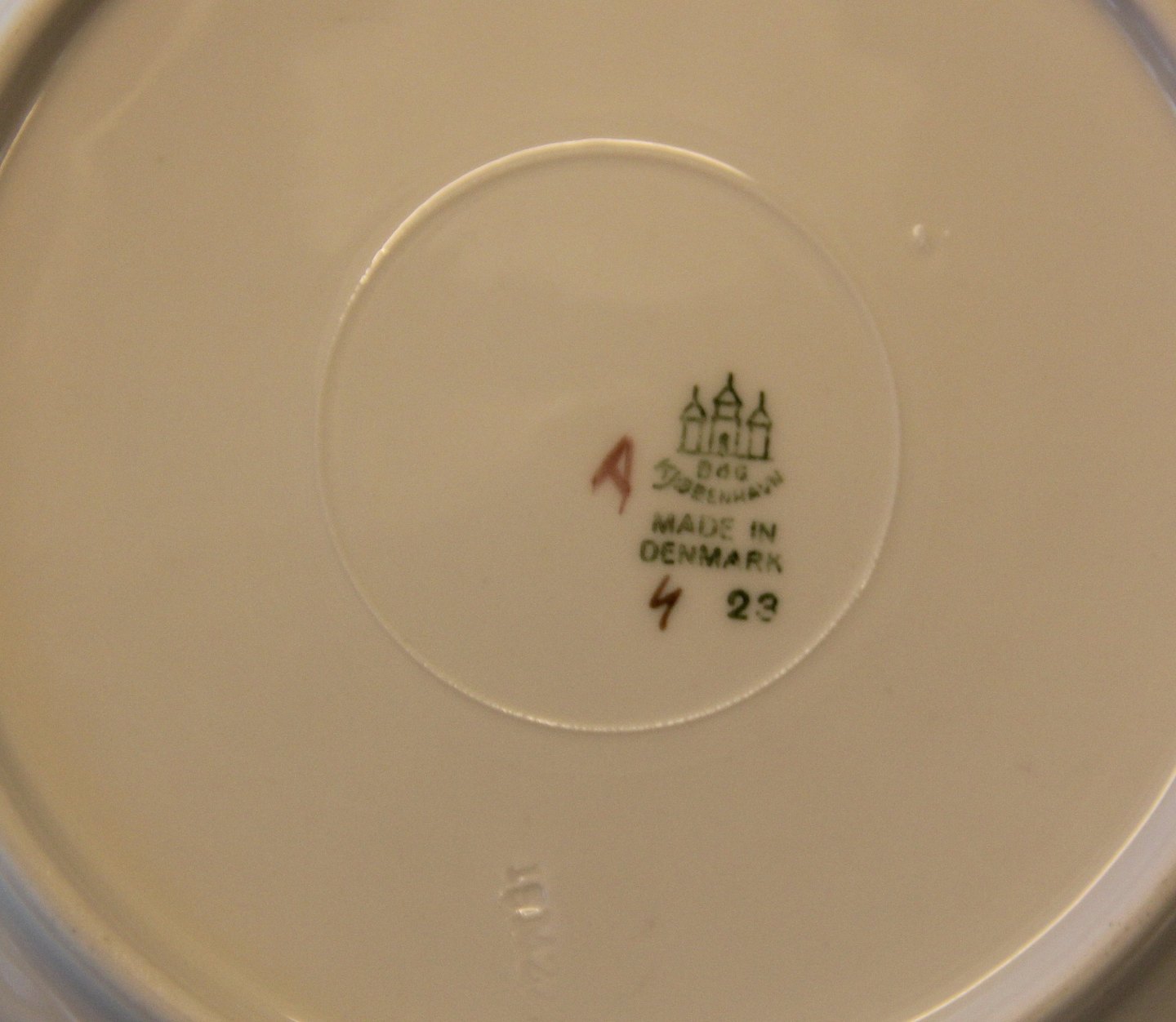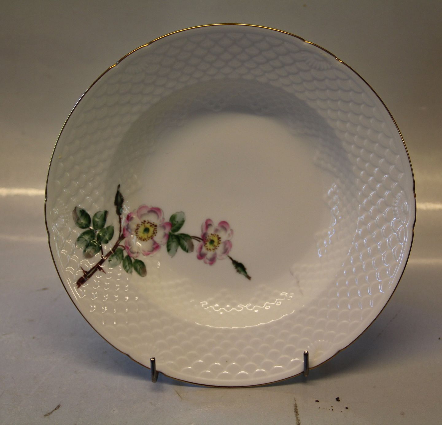 023 Dyb tallerken 22 cm (323) Bing & Grøndahl Victor Hugo vild rose på hvidt porcelæn med og guldkant, form 356 I fin og hel stand