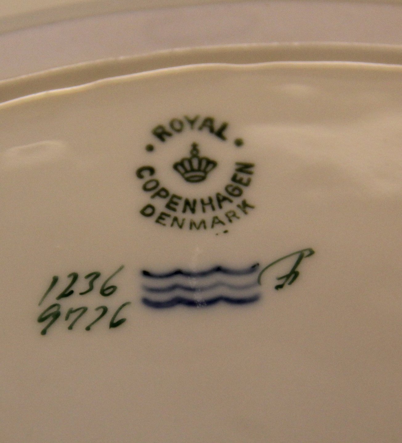 Broager #1236 Kongelig porcelæn Kgl. spise- og kaffestel fra Den kongelige Porcelænsfabrik Grøn på creme porcelæn med guldkant. Af Torkild Olsen TO som også skabte Dagmar