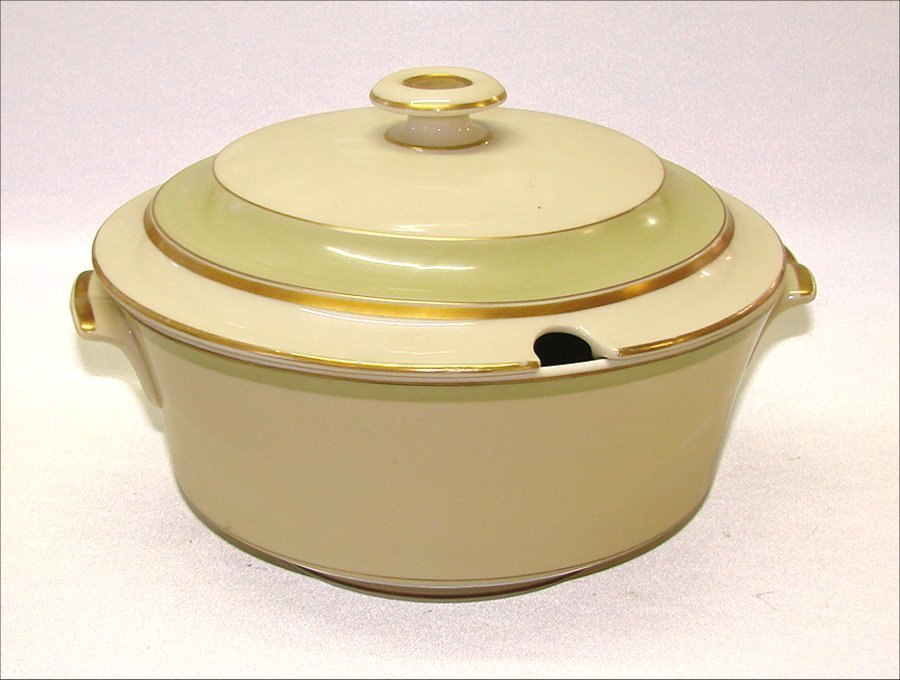 9576-1236 Terrin, rund 2 l Broager #1236 Kongelig porcelæn Kgl. spise- og kaffestel fra Den kongelige Porcelænsfabrik Grøn på creme porcelæn med guldkant. Af Torkild Olsen TO som også skabte Dagmar