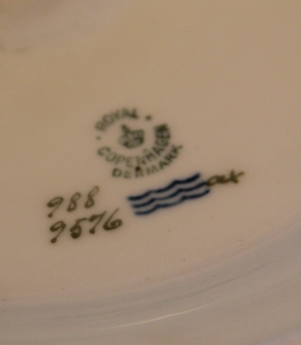 9576-988 Terrin, rund 2 l , ca 17 x 29 cm Dagmar spise- og kaffestel fra Den kongelige Porcelænsfabrik. Grønt porcelæn med bred guldkant med ciseleret relief af stiliserede planter og krone. I fin og hel stand Design Thorkild Olsen 1938