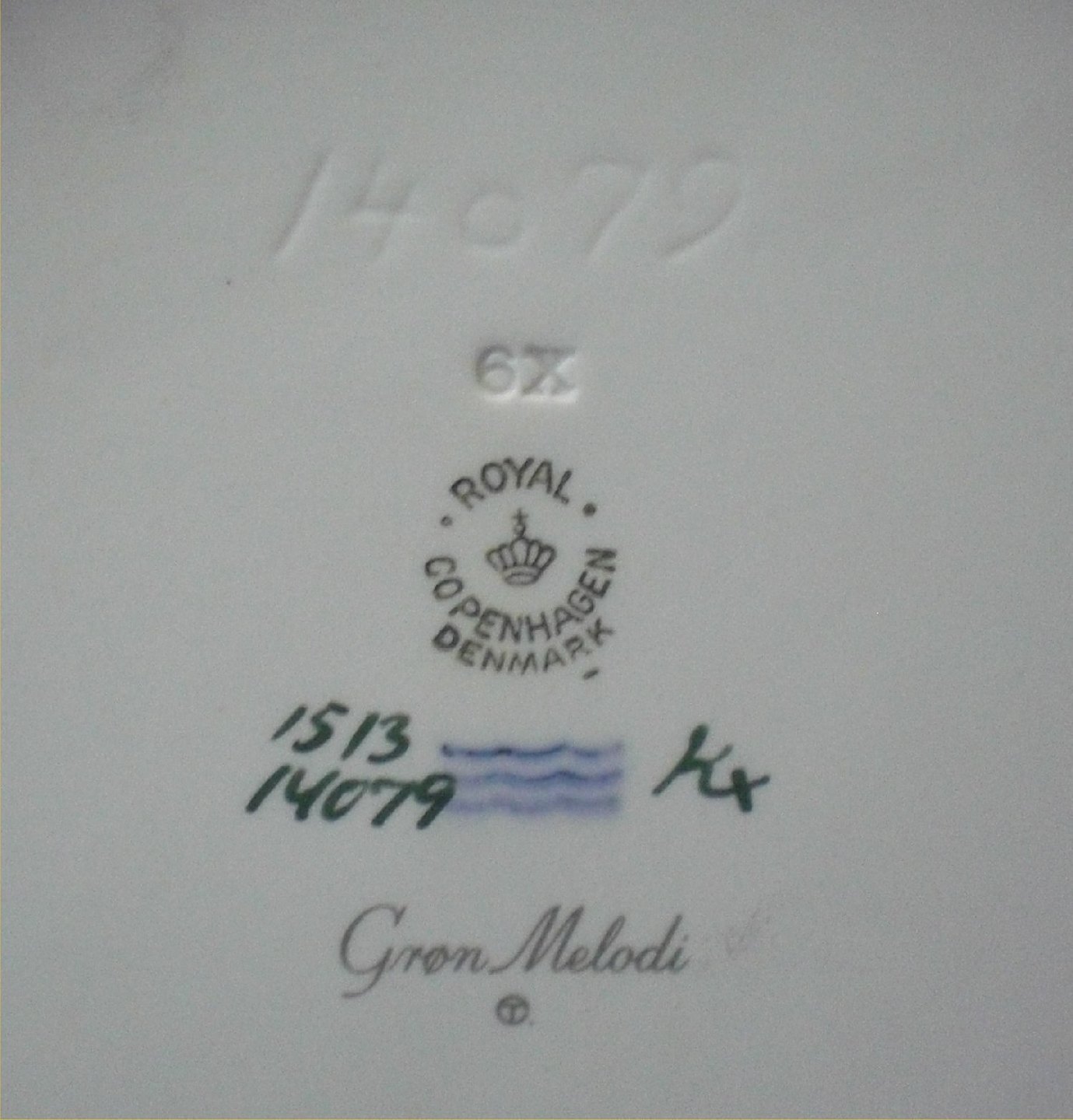 1513-14079 Large Platter 44.5 x 30.4 cm Green Melody #1513 Royal Copenhagen (RC) White glazed ribbed porcelain with green decoration and gold Groen Melodi