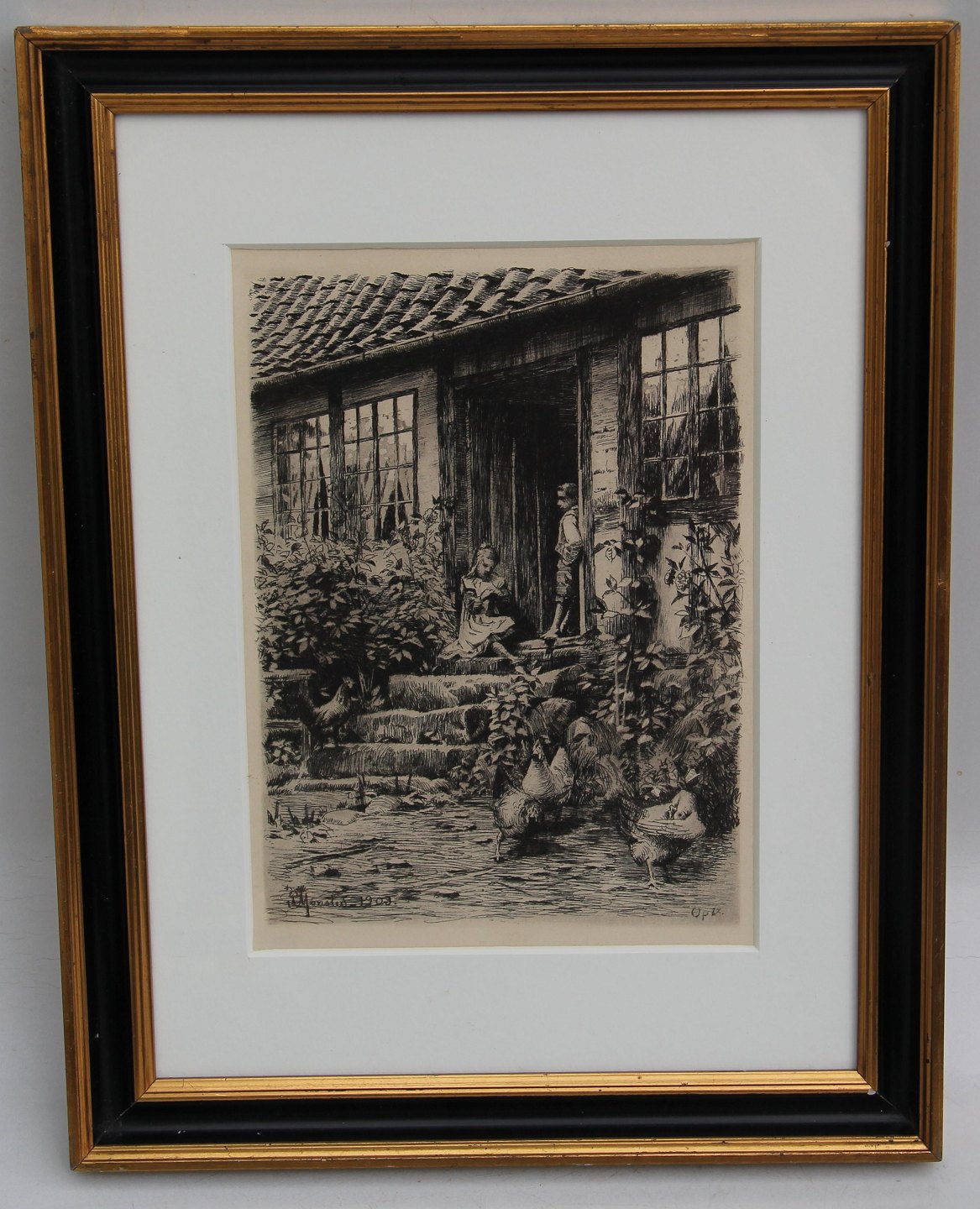 Radering: Peder Mønsted 1903 Paa Trappen 39 x 28 cm inklusiv træramm