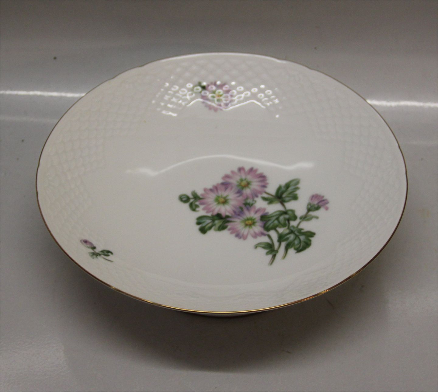 223 Bowl on foot, (medium) 7 x 20 cm (428) Chrysanthemums, sometimes called mums or chrysanths. Pink - Rosa Flower Bing and Grondahl. Marked with the three Royal Towers of Copenhagen. In mint and nice condition Bing & Groendahl White base, pink chrysanthemum, gold rim, form 356 Krysantemum