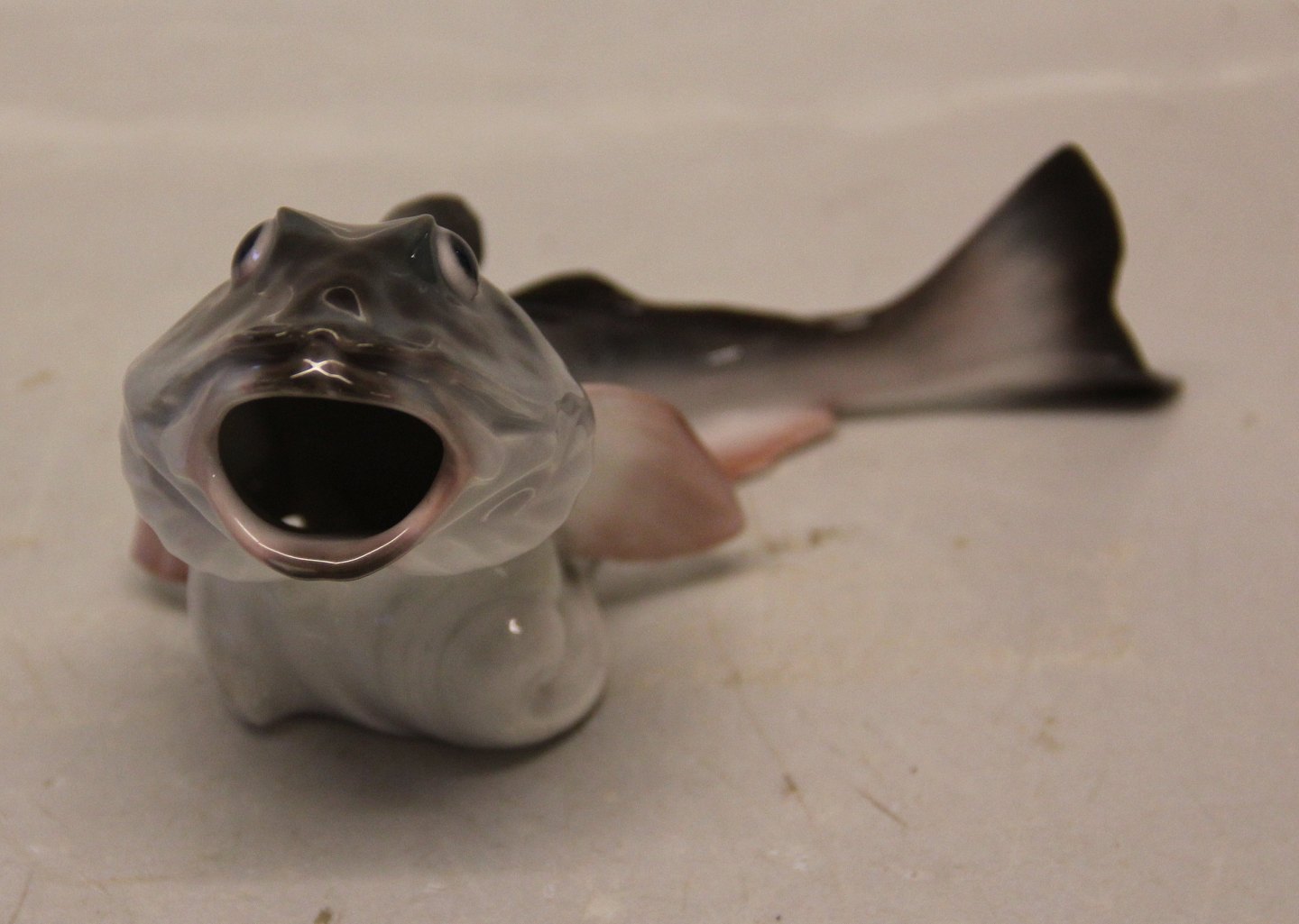 Beskrivelse: 0286 Kgl. fisk med åben mund Malle (Siluriformes) Chr. T 1901 16 cm fra Royal Copenhagen I hel og fin stand