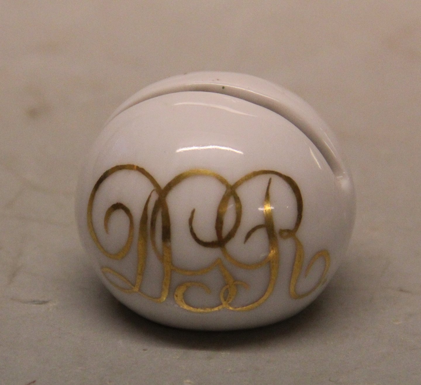 Beskrivelse: 21-470 Kgl. Visitkort holder 4.5 x 5 cm kugle med blomst og monogram DGR 28-5-1928 fra Royal Copenhagen I hel og fin stand