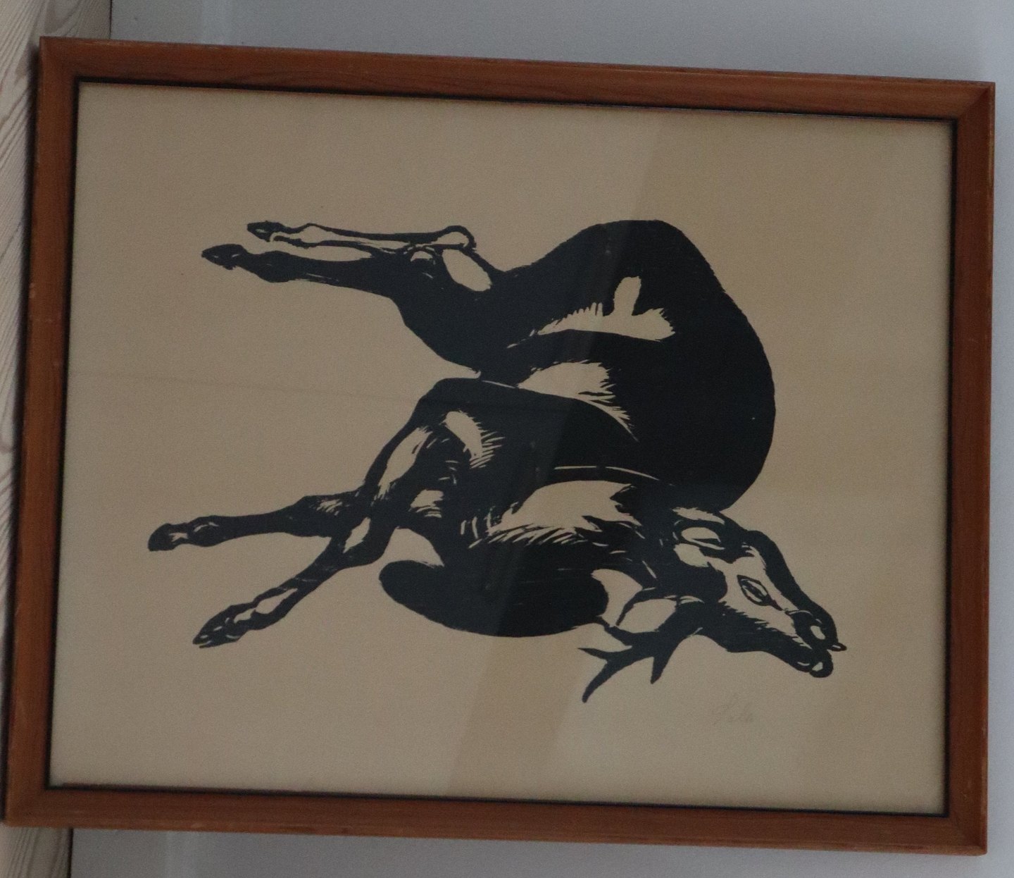 Description: No 379 Axel Salto: Dead Deer Signed Wood cut 31 x 35.5 cm Old wooden frame with glass 39 x 48 cm