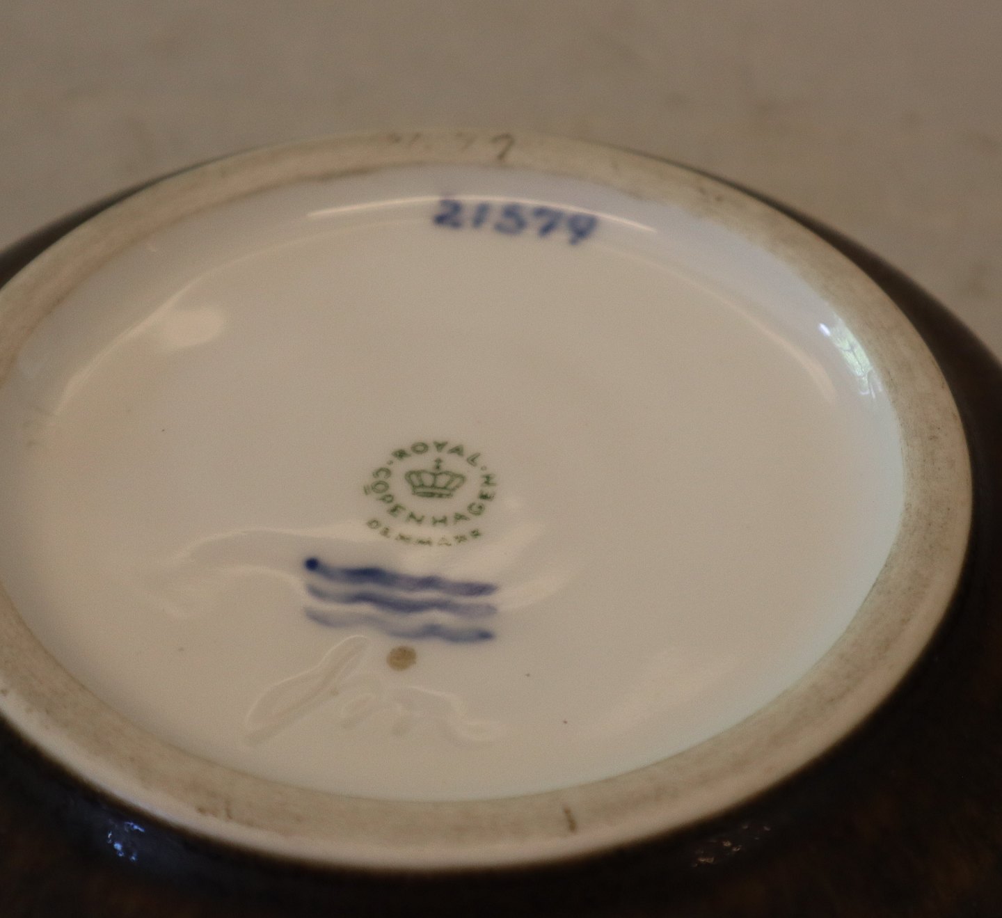 Beskrivelse: Royal Copenhagen 21579 Kgl. Skål med indridset motiv fugl 16.5 cm Jørgen Mogensen marts 1958 stentøj I fin og hel stand JM
