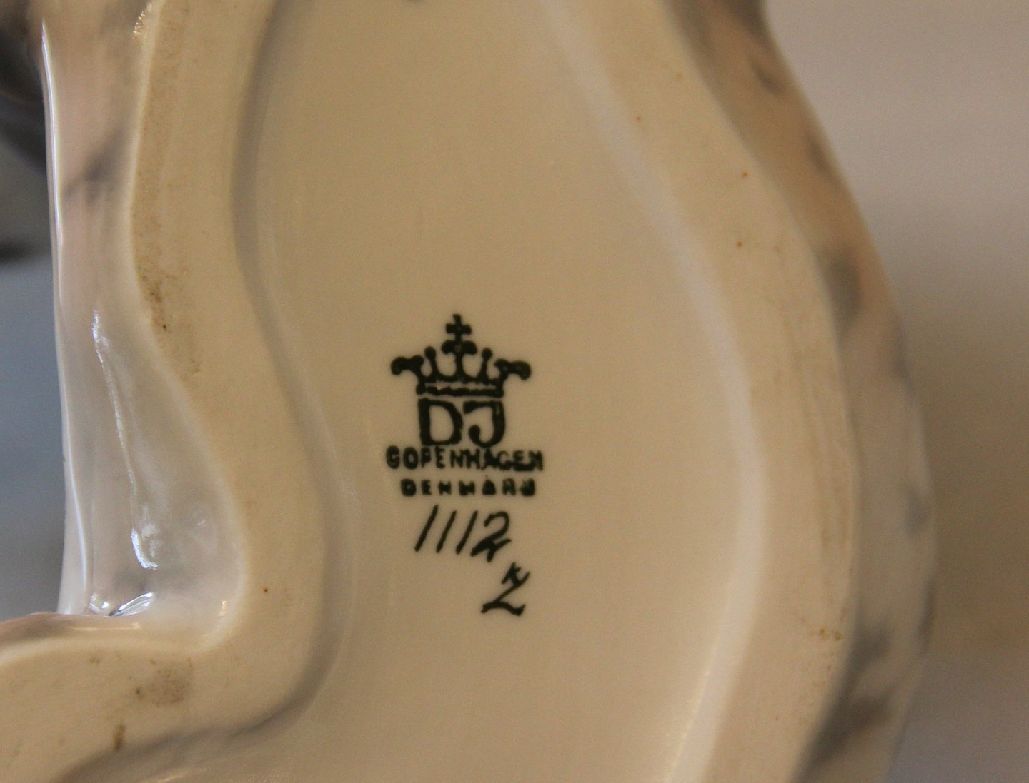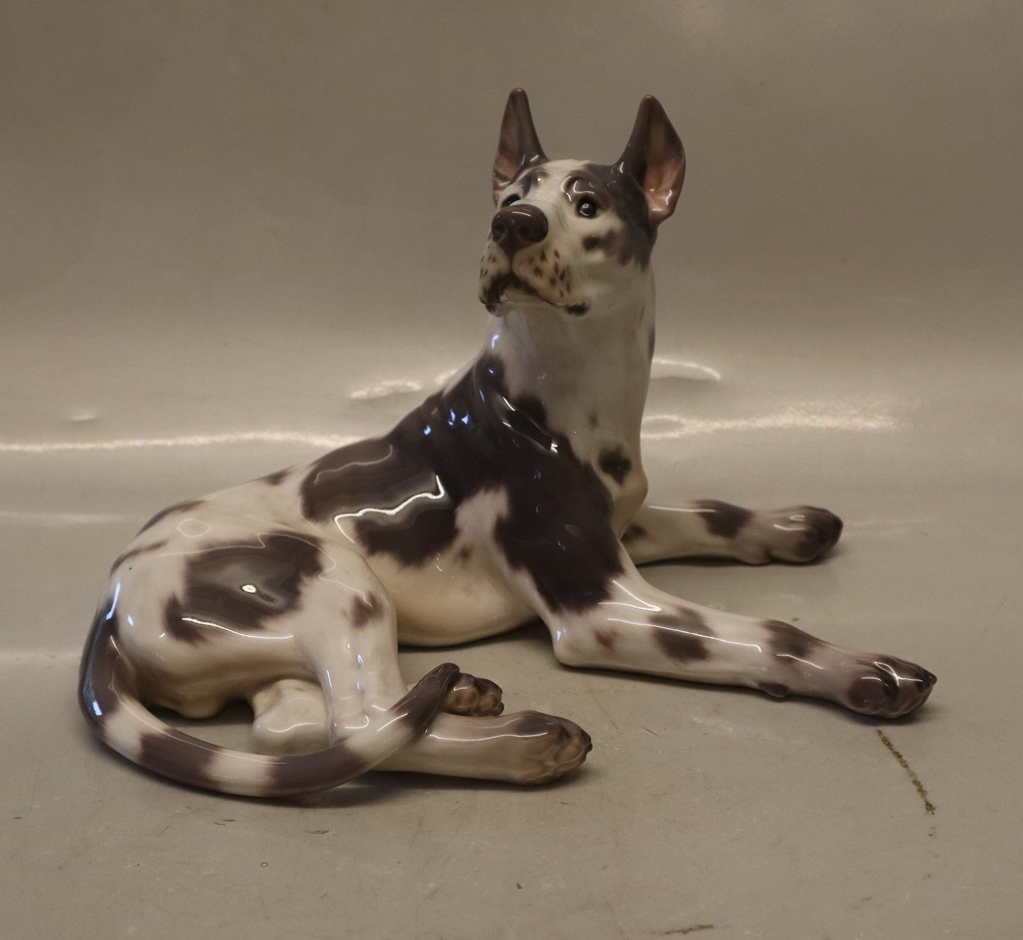 Beskrivelse: Dahl Jensen hund. 1112 Great Dane, liggende 18 x 29 cm Mærket med kongelig krone og DJ Copenhagen i hel og fin stand