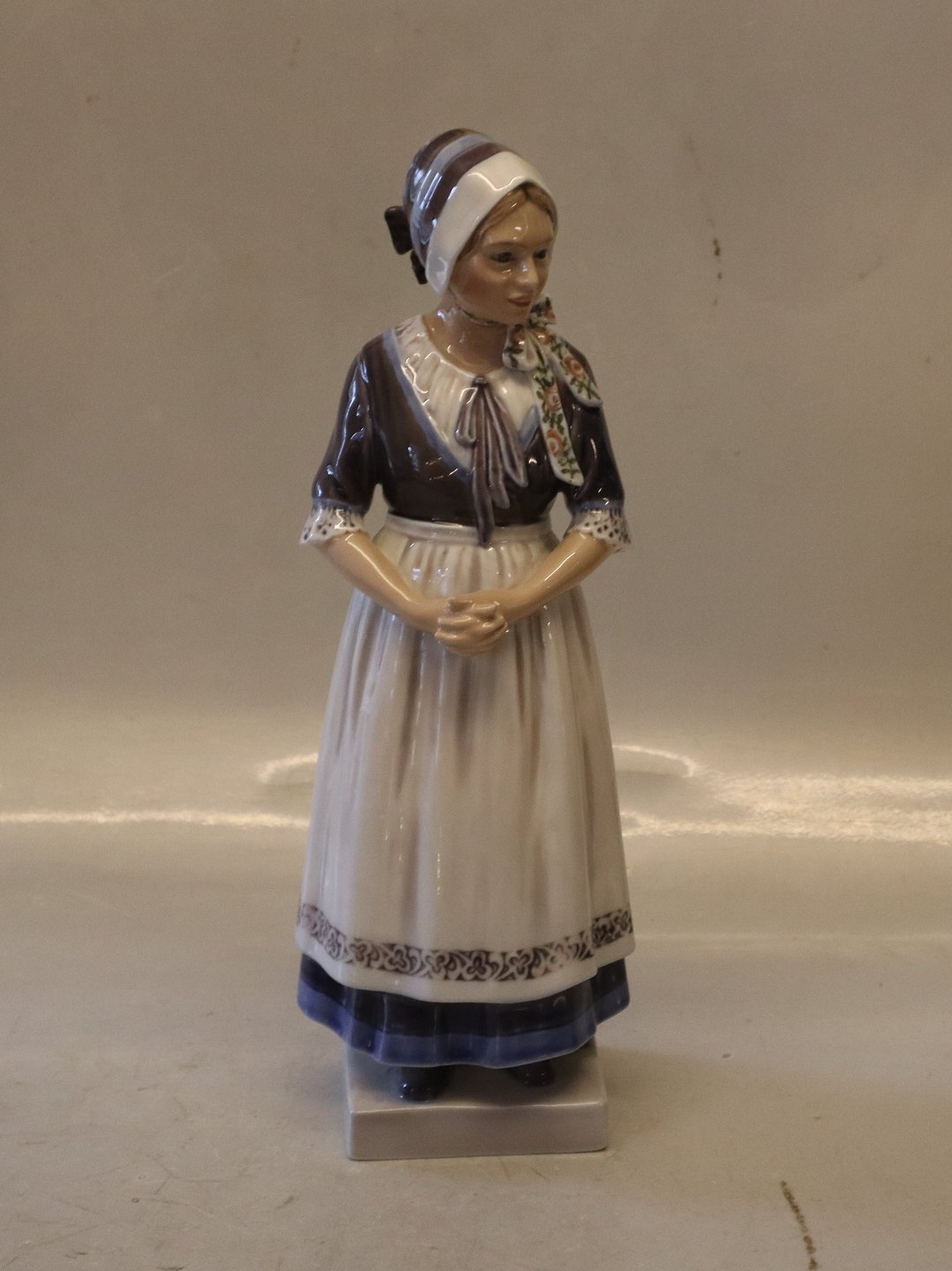 Description: Dahl Jensen 1142 Hedebo Girl (Variations) (DJ) 28.5 cm Marked with the royal Crown and DJ Copenhagen. Woman in national Costumes