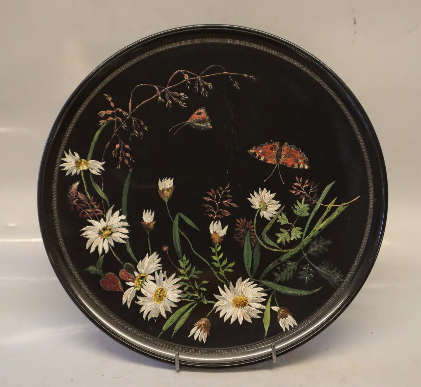 108 Bemalet fad eller platte 27 cm i sort terracotta Blomster og sommerfugle ca 1890 P. Ipsens Enke