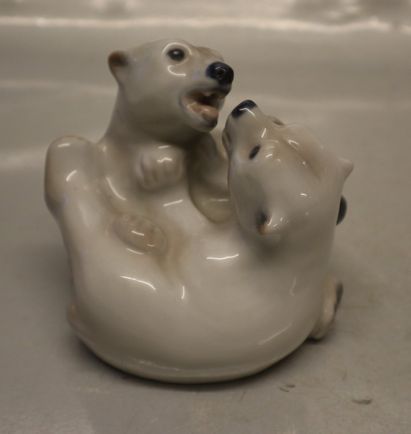 Description: Lyngby Porcelain 90 Lyngby Two Polar bear cubs playing 11 x 12 cm. Marked with a Royal Crown Handpainted, Copenhagen Made in Denmark. The stamp of Copenhagen Porcelain Painting Factory (KPM). In mint condition