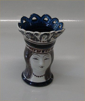 Description: Royal Copenhagen Aluminia Faience figurine. 306-3568 RC Faience Queen in blue from the Chess set by Doreen Middelboe 11 cm