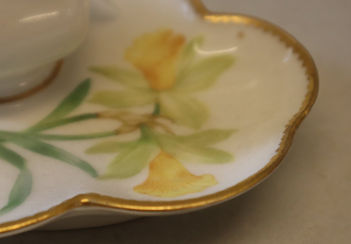 Beskrivelse: Kgl. 9408 Skrivesæt med gule blomster og takket guldkant 16 x 8 cm fra Royal Copenhagen Før 1923 I hel og fin stand Blækhus