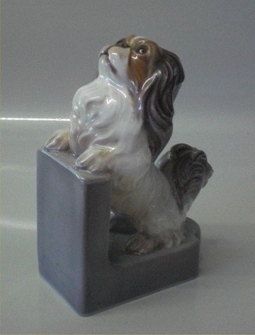 Beskrivelse: Dahl Jensenhund. 1109 Pekingeser bogstøtte 17 cm Mærket med kongelig krone og DJ Copenhagen i hel og fin stand.